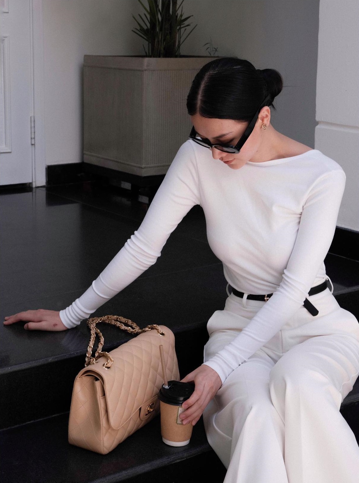 Phương Khánh diện một bộ cánh đơn sắc nhưng đầy ấn tượng. Cụ thể, sự kết hợp giữa áo thun tối giản và quần âu ống suông đã tạo nên bộ trang phục nữ tính, thanh lịch và không kém phần trẻ trung. Tổng thể bộ đồ càng thêm sang chảnh nhờ chiếc thắt lưng. Phương Khánh gợi ý kiểu tóc giúp vẻ ngoài của chị em thêm long lanh, quý phái khi diện outfit tối giản, đó là tóc búi thấp.